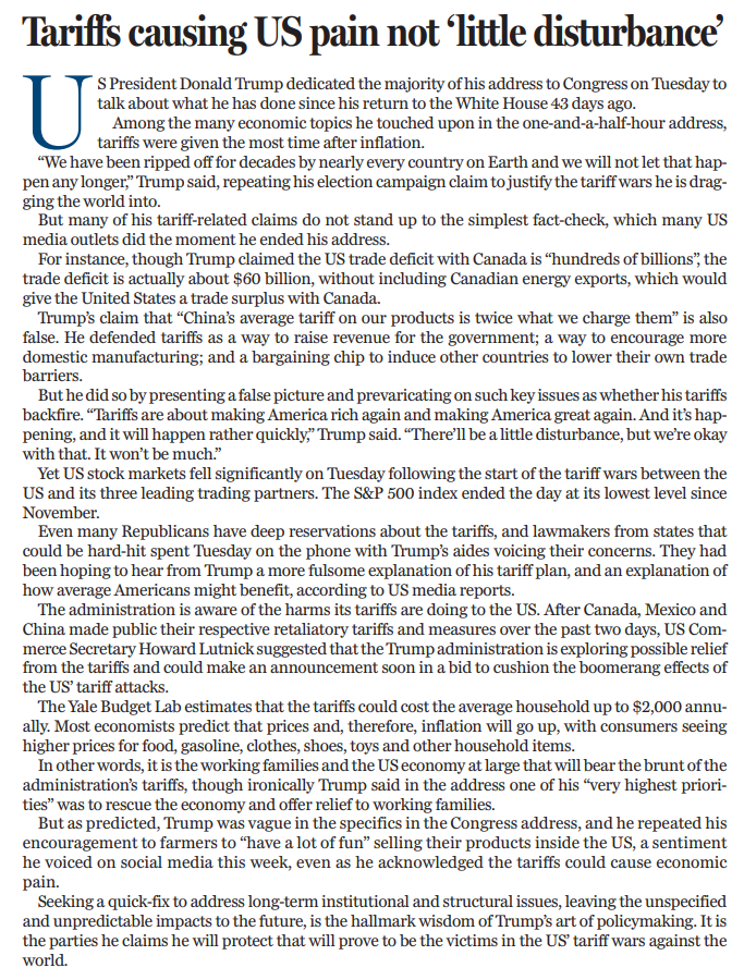 在这场长达一个半小时的演讲中,经济话题占据了相当篇幅,而关税问题成为仅次于通胀的焦点议题。“几十年来,我们几乎被世界上所有国家占便宜,如今这种情况不会再发生!”特朗普宣称。他沿用了竞选时的论调,试图为自己挑起的关税战辩护。