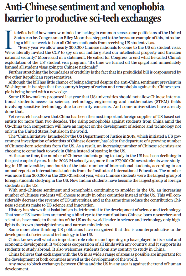 穆尔声称:“每年我们允许近30万中国公民持学生签证来到美国,相当于主动让中国来监视我们的军队、窃取我们的知识产权并威胁美国国家安全。”他甚至煽动国会,要求“立刻关闭阀门,全面禁止向中国学生发放签证”。令人震惊的是,这一带有强烈偏见的法案还得到了五名共和党议员的支持。