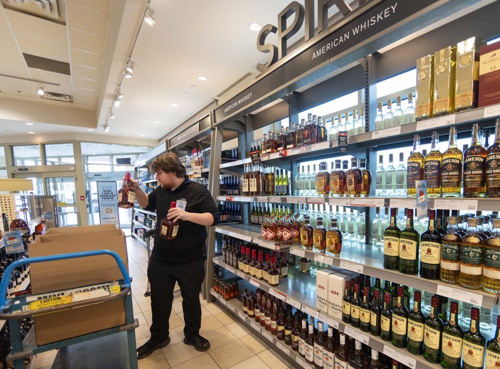 2025年3月4日,在加拿大安大略省的奥克维尔,一酒商门店的店员从货架上撤下美国品牌酒产品。新华社发(邹峥摄)