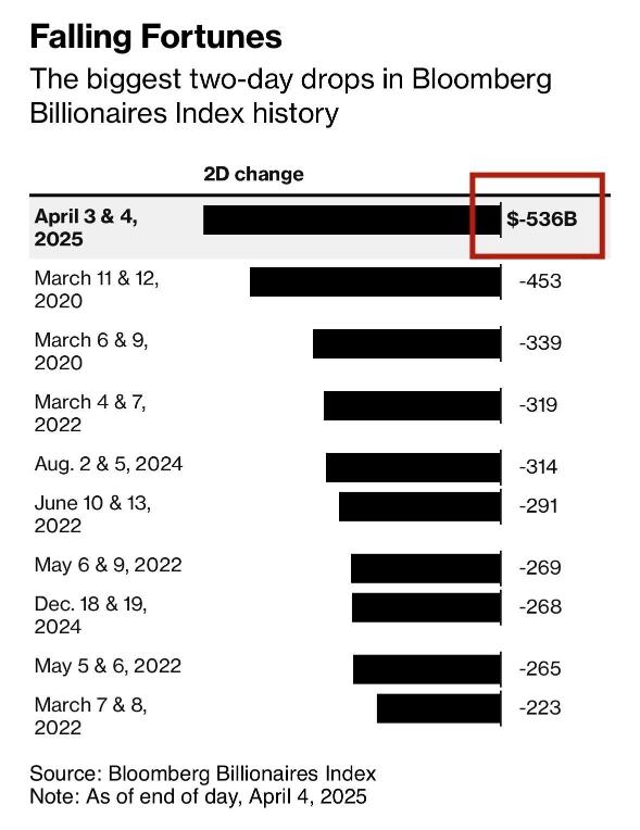 报道说,从4月3日股市开盘到4月4日收盘,财富榜上的亿万富翁们总共损失了5360亿美元。