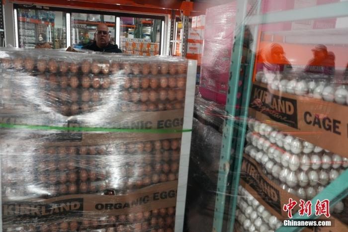 受禽流感影响,近期美国各地鸡蛋供货紧张,价格飞涨。图为超市工作人员运送鸡蛋。中新社记者 廖攀 摄