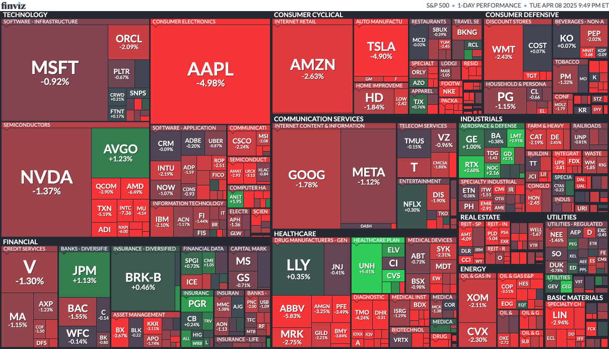 △4月8日 标准普尔 500 指数股票大面积下跌