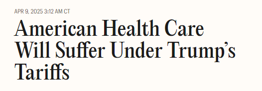 但文章认为,大幅提高进口关税将重创美国本就脆弱的医疗供应链,从基础药品、医用手套到手术服、静脉注射器材,这些维系医疗安全的必需品多依赖进口。关税不仅推高物资的价格,更将导致患者的治疗成本激增。