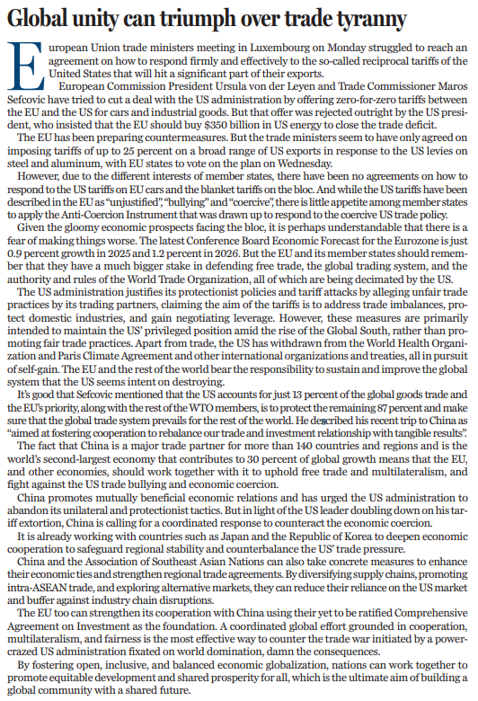 作为世界第二大经济体,中国是140多个国家和地区的主要贸易伙伴,对全球经济增长的贡献率高达30%。这意味着欧盟和其他经济体应与中国共同努力,维护自由贸易和多边主义,反对美国贸易霸凌和经济胁迫。