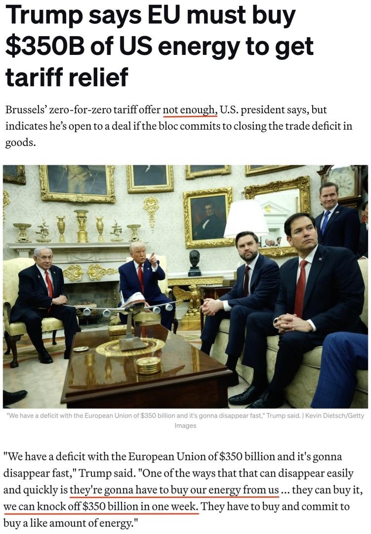 “他们必须从我们这里购买能源……这样我们可以在一周内砍掉3500亿美元(贸易逆差)。”