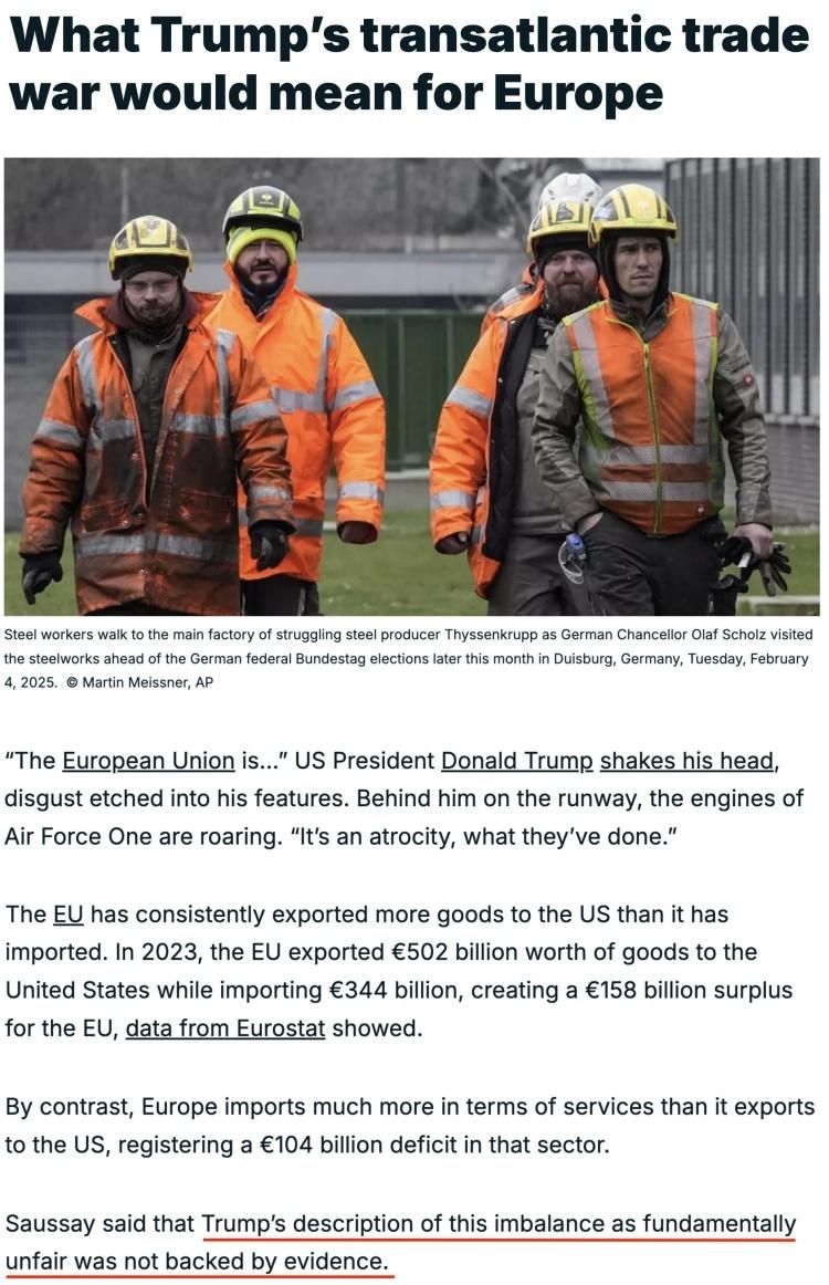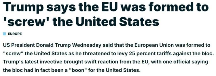 他一直指责欧盟给美国造成“数千亿美元”贸易赤字是一种“暴行”,甚至声称欧盟的成立初衷就是“坑害美国”。