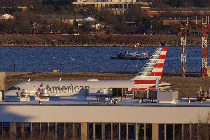 2月1日,工作人员在美国华盛顿里根国家机场旁的波托马克河上打捞飞机残骸。新华社发(亚伦摄)