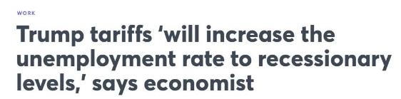 保守派智库美国企业研究所(American Enterprise Institute)经济政策研究主任、乔治城大学教授迈克尔·R·斯特兰(Michael R. Strain)直言:“若(关税)政策持续,(美国)失业率将攀升至经济衰退的水平。”