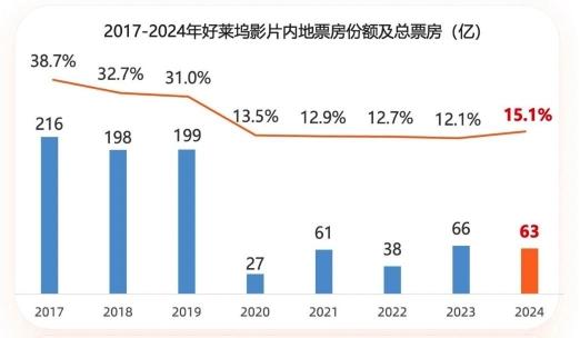 根据灯塔《2024年好莱坞影片内地市场观察》,2024年好莱坞影片内地票房份额略有复苏,占全年大盘的份额略有提升达到15.1%。