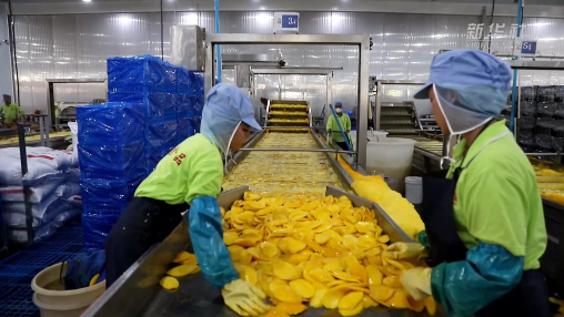 中宝(柬埔寨)食品科技有限公司的芒果干加工厂就坐落在磅士卑省尖山县。工厂里,工人们正忙着将刚采摘的鲜芒果卸车、清洗、切削、烘干……最终制成芒果干装箱后通过海运销往中国,十日内便可到达中国商超的货架之上。