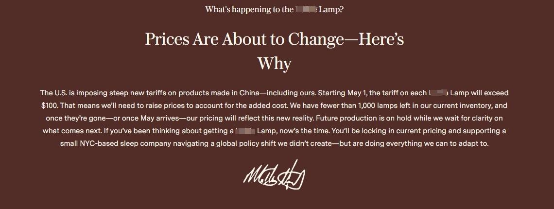 △马修·哈塞特在其企业产品网站发布的关税影响公告:美国正对中国生产商品加征关税,我们的产品也在其中。从5月1日起,我们所出售的台灯每盏都会被加征超100美元的关税。这意味着我们需要为额外的支出涨价。我们当前库存中还有不到1000盏台灯,一旦售罄或5月到来,我们的商品价格将反映新的现实。