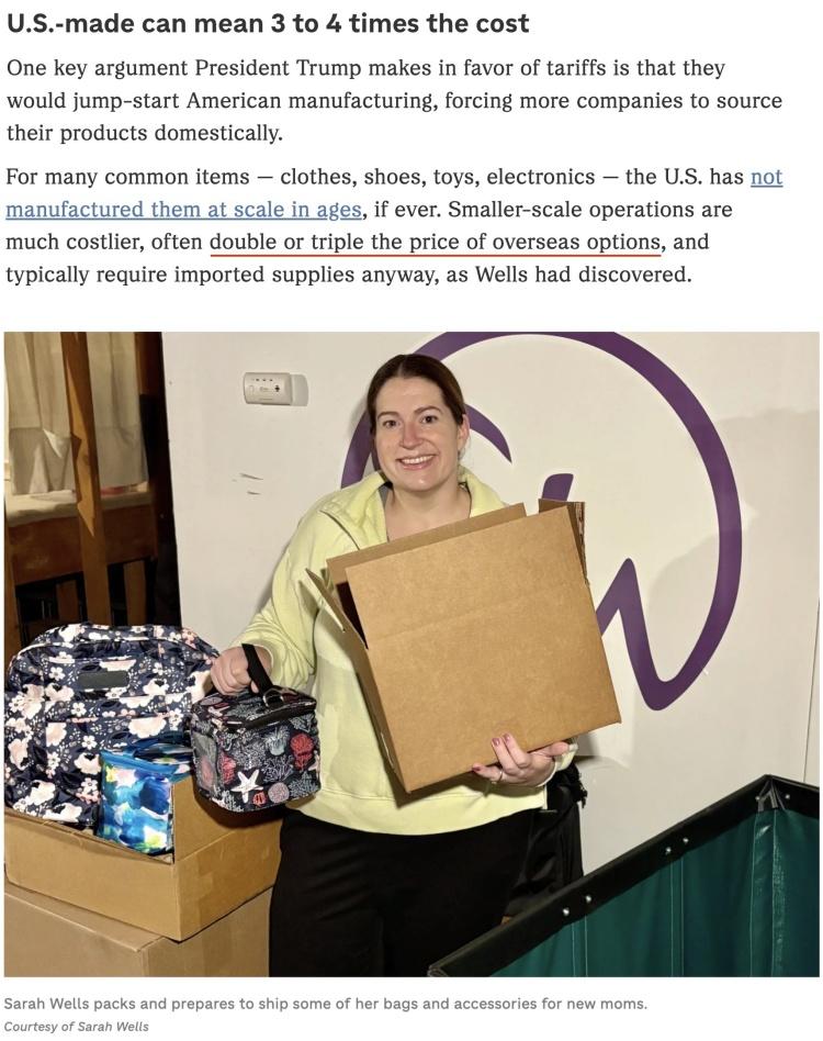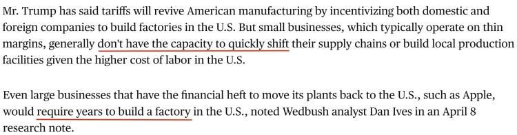 特朗普曾表示,关税将通过激励国内外公司在美国建厂来重振美国制造业。但由于美国的劳动力成本较高,通常利润微薄的小企业通常没有能力迅速转移供应链或在当地建立生产设施。