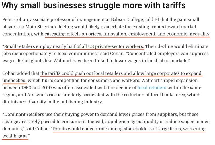 美国商学院巴布森学院管理学副教授彼得·科恩认为,鉴于小型零售商雇佣了美国私营部门近一半的工人,他们的减少将不成比例地减少当地社区的就业机会。关税还可能会把当地零售商挤出市场,让大公司不受限制地扩张。
