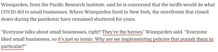 维恩加登就此发出灵魂拷问:“每个人都在谈论小企业,他们是英雄。大家都喜欢小企业,所以这太讽刺了。为什么我们要用关税惩罚它们?”