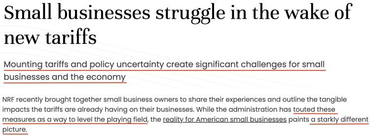 美国全国零售商联合会指出,虽然政府吹捧这些措施是公平竞争的一种方式,但美国小企业的现实却描绘了一幅截然不同的画面。不断增加的关税和政策不确定性给小企业和经济带来了重大挑战。