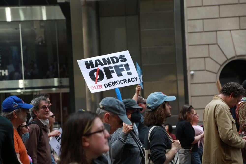 4月19日,人们在美国纽约街头参加抗议活动。新华社记者刘亚南摄