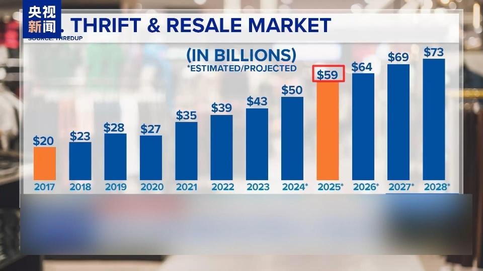 美国二手商品交易在线平台思雷达普公司的数据显示,2017年美国二手交易市场的价值只有200亿美元。根据该公司的预测,受关税政策影响,2025年二手交易市场价值将升至590亿美元,此后也将一路飙升,照此发展2028年的价值将达到730亿美元。