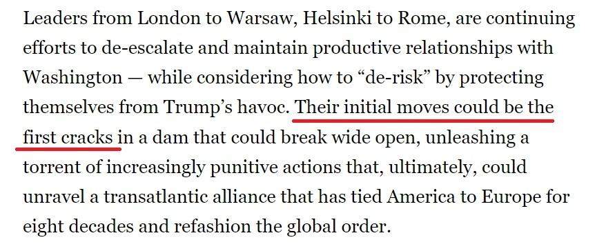 文章警告,欧洲对美国关税最初的反制举动可能是“大坝的第一道裂缝”,随着美国的变本加厉,大坝或将破裂,引发更多更严厉的反制行动。而这最终可能会瓦解将美国与欧洲联系了80年的跨大西洋联盟,并重塑全球秩序。
