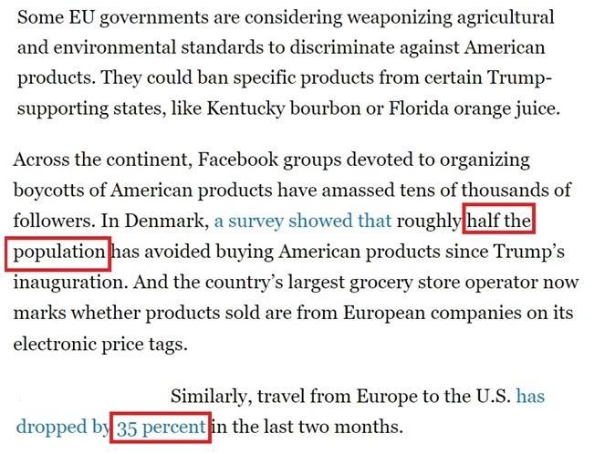 其中一个选择是“针对特定产品”发力:一些欧盟国家及其公民正在考虑以农业和环境标准为武器,回击美国特定企业或行业,包括禁止进口来自某些支持美国总统特朗普的州的产品,如肯塔基州的波旁威士忌或佛罗里达州的橙汁。