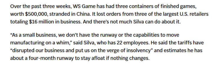 比如,一家成立于2000年的马萨诸塞州玩具公司,其产品由于曾被名人推荐,在北美地区超过14000家商店都有售卖。而关税战使得这家公司25年来的健康增长戛然而止。