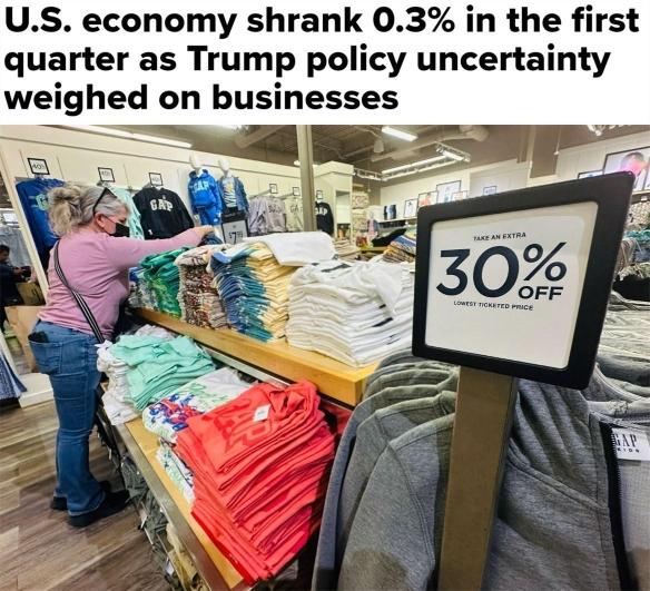 首先,现在的关税政策使美国与其他国家的贸易摩擦加剧,企业为规避关税带来的成本,提前增加进口,这也使得美国进口量大幅增加。一季度美国贸易逆差创纪录地扩大,远超市场预期,拉低了美国一季度GDP。