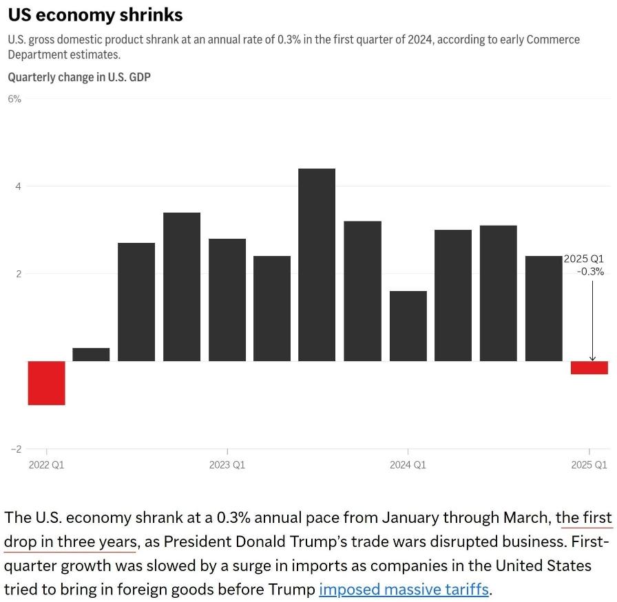 美国商务部4月30日公布最新数据显示,2025年第一季度,按年率计算,美国国内生产总值(GDP)环比萎缩0.3%,为2022年以来的首次收缩。