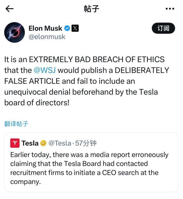 对此,马斯克在X平台上连续发布多条贴文回怼,称“华尔街日报文章是虚假的,没有报道董事会对此事的明确否认态度,属于极其严重的违反道德的行为。”