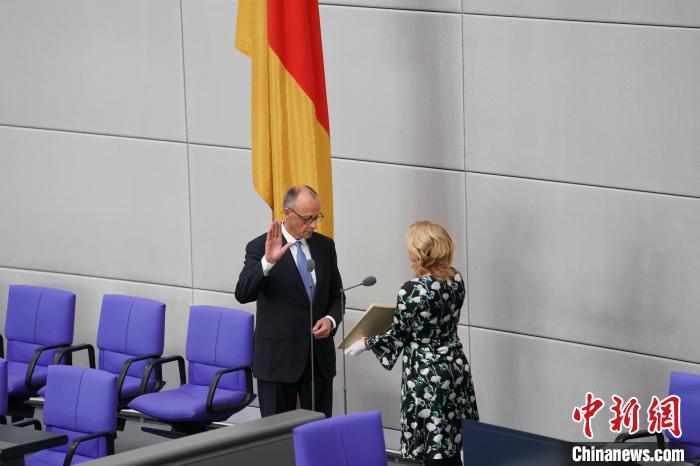 当地时间5月6日,德国联邦议院召开全体会议选举新总理。在当日下午举行的第二轮总理选举中,德国联邦议院以325票支持选举默茨为德国联邦总理。图为默茨当日在德国联邦议院宣誓就职。中新社记者 马秀秀 摄