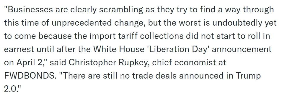 金融市场研究专家鲁普基认为,虽然企业界试图找到办法度过美国政府正式全面加征“对等关税”之前这段“前所未有的动荡时期”,但“最糟糕的情况无疑尚未到来”,因为美国政府迄今未与贸易伙伴达成任何贸易协议。