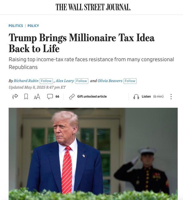 中新网5月9日电 据美国《华尔街日报》8日报道,在拒绝征收“百万富翁税”仅15天后,美国总统特朗普又在重新考虑一项新的税收结构方案,将年收入超过250万美元人群的个人所得税最高税率从37%恢复到39.6%。
