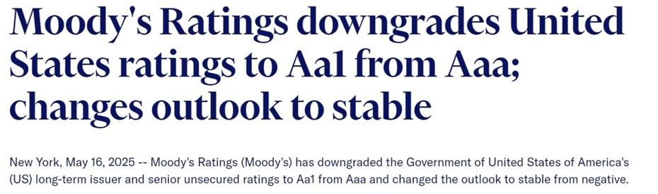 国际信用评级机构穆迪公司16日宣布,由于美国政府债务及利息支出增加,该机构决定将美国主权信用评级从Aaa下调至Aa1,同时将美国主权信用评级展望从“负面”调整为“稳定”。
