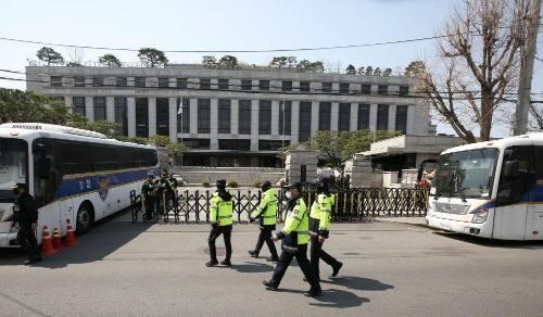 4月3日,在韩国首尔,警察在韩国宪法法院前执勤。新华社记者姚琪琳摄