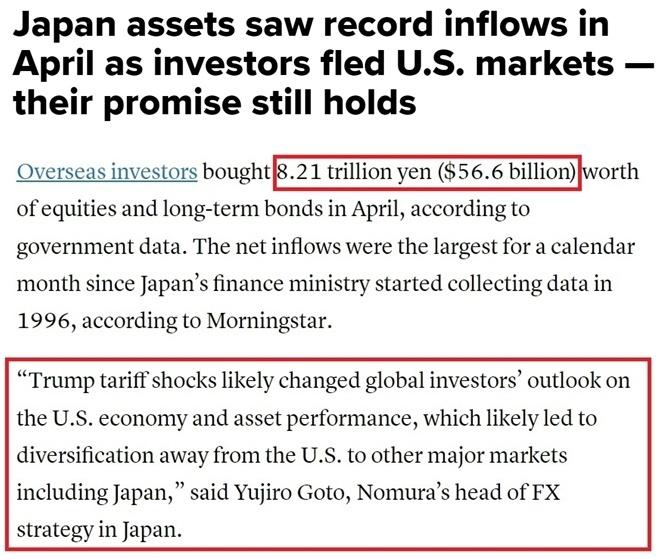 值得注意的是,在日本对美投资可能被“吓退”的同时,“逃离”美国的资金正大量涌向日本。