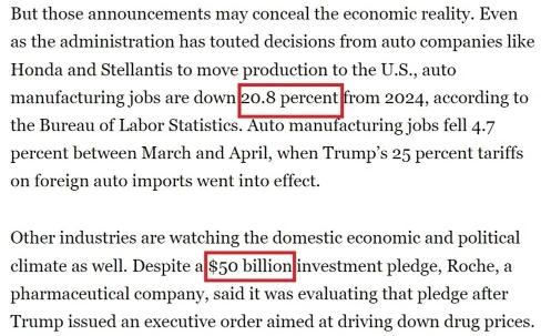 可以说,本届美国政府自上台以来,为了推进其关税政策已经用尽话术。其中之一就是高关税有助于迫使外国企业和跨国公司将生产线迁至美国,通过加大对美投资实现美国的制造业复兴和就业岗位井喷。