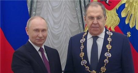 当地时间5月22日,俄罗斯总统普京授予俄罗斯外长拉夫罗夫“圣安德烈”勋章。