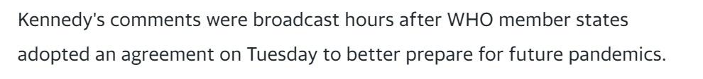 外界注意到,在小肯尼迪的视频讲话播出前几小时,本届世卫大会刚刚审议通过了《世界卫生组织大流行协定》。