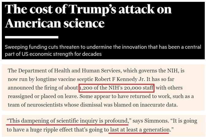 美国国立卫生研究院的遭遇,堪称该国众多领先科研机构目前所处混乱局面的缩影。在宾夕法尼亚大学教授西蒙斯看来,“这种对科学探究的抑制将产生深远影响和巨大的连锁反应,至少会持续一代人的时间”。