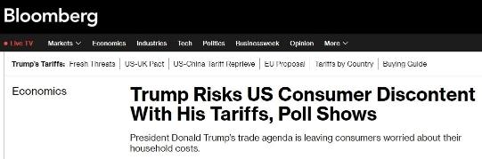 彭博社近日民调显示,56%的受访美国人认为,特朗普对其他国家征收的关税对他们的家庭财务状况产生了不良影响。即使特朗普政府一直在鼓吹加关税能让产业回流美国并增加财政收入,约52%的受访者还是表示,美政府承诺的好处不值得他们为此付出的经济代价。