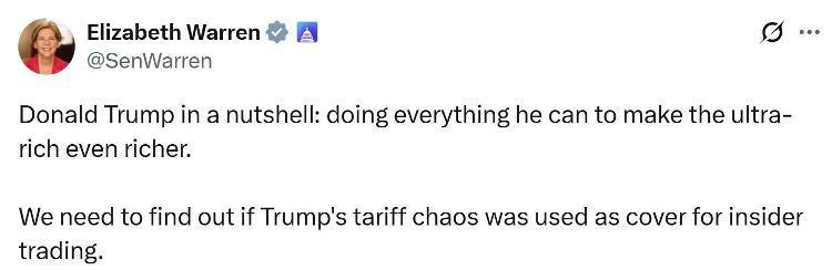 美国民主党籍联邦参议员伊丽莎白·沃伦表示,鉴于特朗普政府正尽一切可能让美国富人们更加富有,有必要弄清楚白宫制造的关税混乱是否被用作内幕交易的掩护。