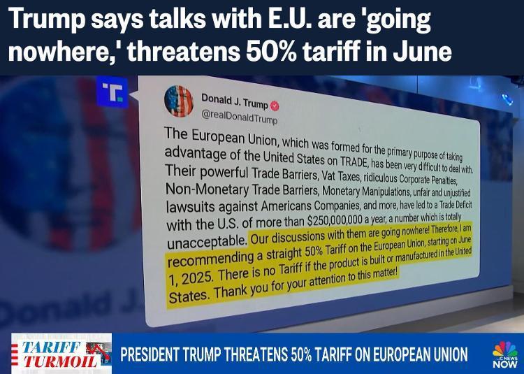 美国总统特朗普23日在社交媒体发文威胁称,由于美国与欧盟的谈判“毫无进展”,他建议从6月1日起对来自欧盟的商品征收50%的关税。