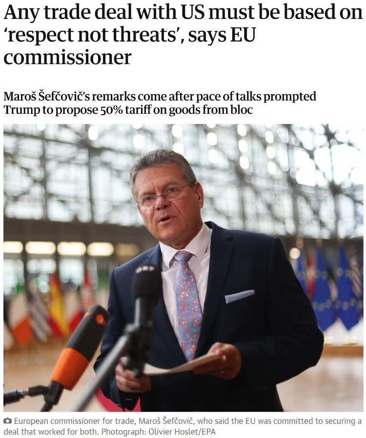 面对最新威胁,欧盟委员会负责贸易和经济安全等事务的委员马罗什·谢夫乔维奇回应称,欧美之间的贸易协议必须基于相互尊重,而不是以威胁为手段。