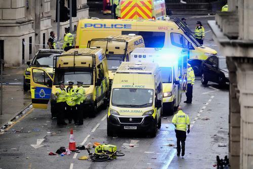警察和应急人员在英国利物浦的汽车冲撞事件现场工作