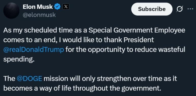 马斯克在其社交媒体平台X上发文表示,他即将离开特朗普政府,不再继续担任特别政府雇员一职。此外,马斯克在文中向美国总统特朗普致谢,并表示政府效率部(DOGE)团队将继续在整个政府范围内开展工作。