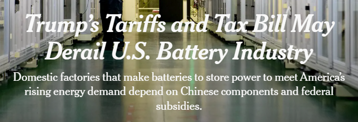 在美国的电力行业,储能电池正扮演着愈发重要的角色。它们像海绵一般,在用电低谷储存电能,在用电高峰释放能量。但是,在美国本土生产储能电池的工厂依赖中国组件和联邦政府的补助。《纽约时报》近期发布的一篇报道注意到,美国政府的关税政策可能会使这个新兴行业的发展偏离正轨。