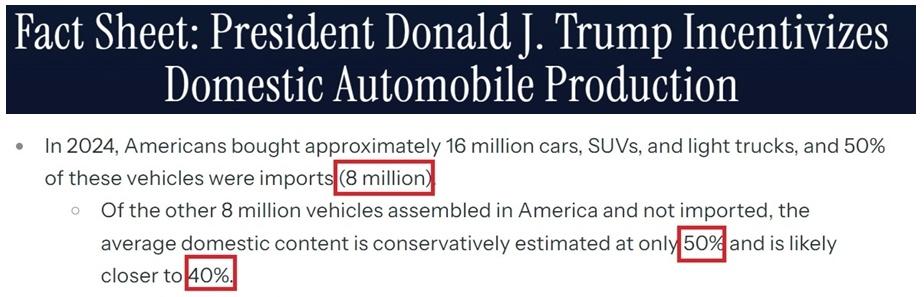 白宫数据显示,2024年美国进口了约800万台汽车,占全年汽车销量的一半。剩余一半在美国组装的汽车中,国内零部件价值占比仅约为40%到50%。
