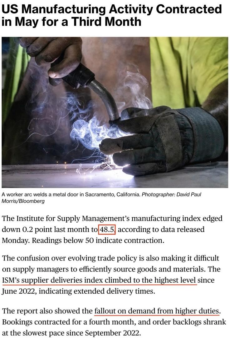 美国供应管理协会(ISM)公布的最新报告显示,美国5月制造业采购经理人指数(PMI)从上月的48.7%降至48.5%,连续第三个月低于50%的荣枯分界线。