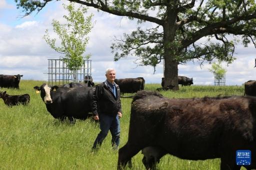 5月22日,在美国艾奥瓦州,比尔·佩利特查看养殖的牛群。新华社记者 刘亚南 摄