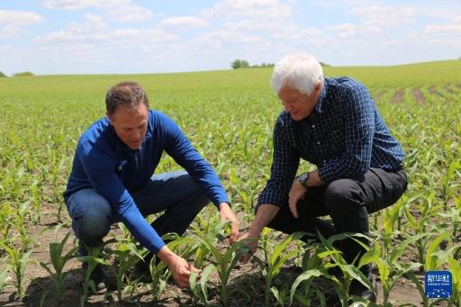 5月23日,在美国艾奥瓦州,艾奥瓦州大豆协会市场部高级主任格兰特·金伯利(左)和他的父亲瑞克·金伯利查看种植的玉米。新华社记者 刘亚南 摄