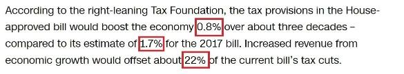 美国税务基金会的研究显示,法案中的减税措施将在大约30年内推动美国经济增长仅0.8%,甚至还不如2017年减税法案的表现。而经济增长带来的收入增加只够抵消当前法案减税规模的约22%。