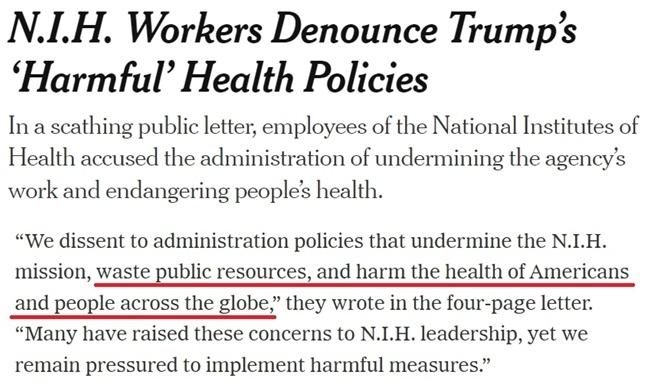 近日,NIH近百名现任和新近被解职的职员发表联名信,批评美国现政府“有害”的卫生政策危害美国和全球人民的健康,将科学研究政治化并浪费公共资源。